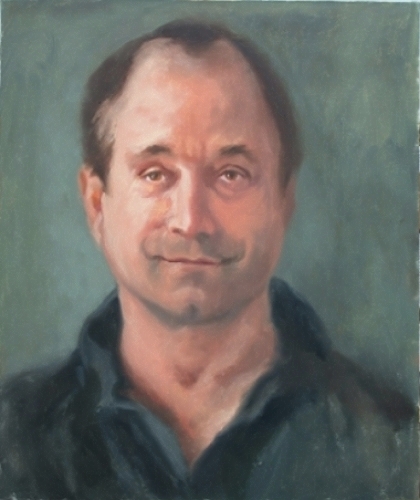 Study for "SYNERGISTIC ADVERSARIES: Mark Tansey, Artist, 2001," Oil on Canvas, 20" h x 16" w, 2001